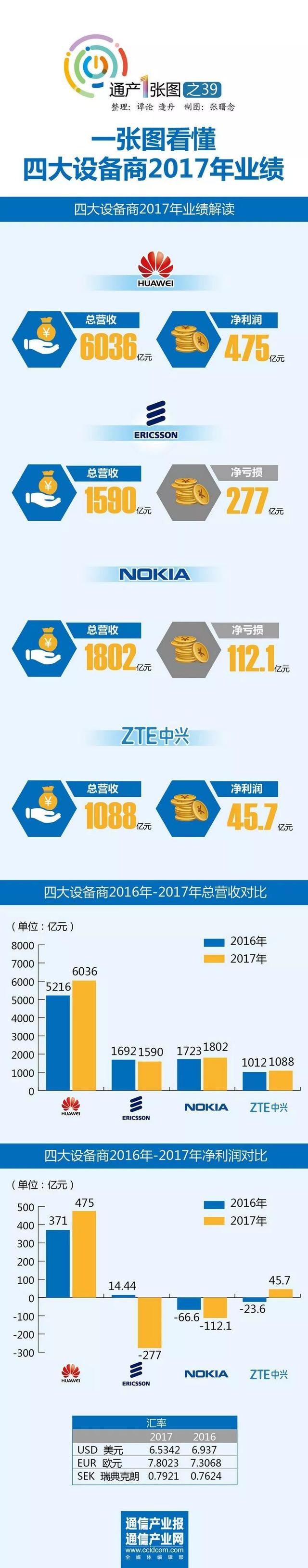 长时期占据通信业霸主地位的爱立信在2017年则陷入亏损泥潭,达277亿元,营收同比下降10%至1590亿元;和阿朗合并两年后的诺基亚仍未走向盈利,亏损112亿元,营收下降2%至1802亿元。