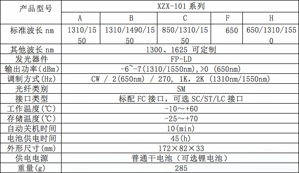 XZX-101系列手持式光源可根据用户要求提供1到4个波长的稳定输出,既可以提供650nm可见红光,也可以向单模光纤测量提供1310nm和1550nm的双波长激光输出,也可以向单模光纤测量提供1310nm/1490nm/1550nm的三波长激光输出,或者同时提供850 /1310 /1550 nm三波长或850/1300/1310/1550nm四个波长激光输出,广泛用于光纤网络领域的安装,运营和维护工作。