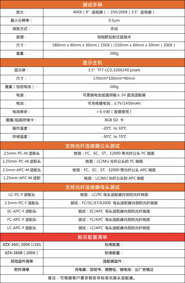 - 可检测SC、FC、ST、LC、E2000、MU等所有PC和APC的光纤连接器公头端面及适配器里面的母头端面