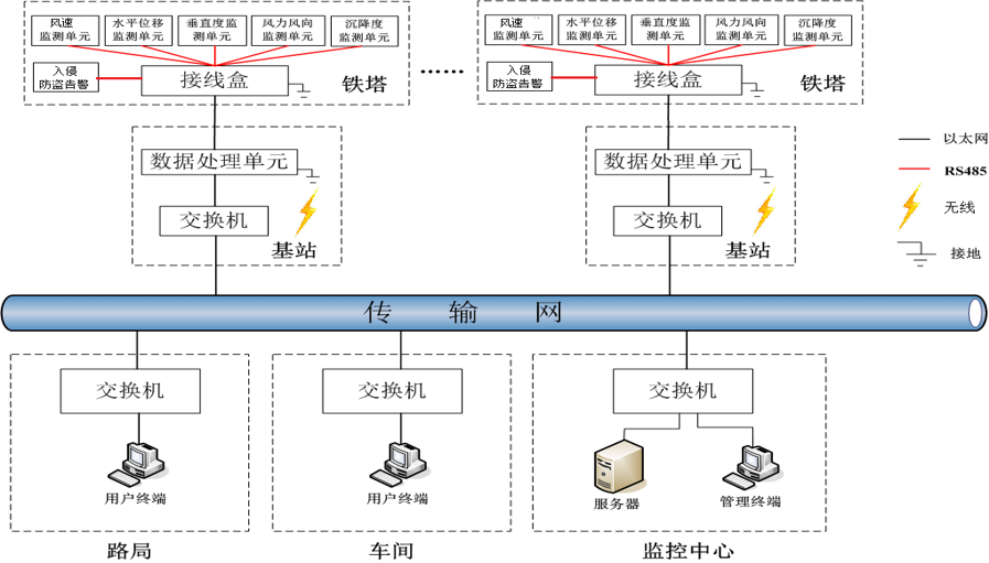 铁塔在线监测系统包括数据采集单元(传感器)、数据处理单元、传输系统、数据处理服务器(铁塔在线监测系统综合分析软件)和客户管理终端。系统通过数据采集单元对铁塔的状态和环境等参数进行实时监测与监控,将采集到的数据通过传输系统、以太网或无线3G/GSM方式传送到后台数据处理服务器。由铁塔在线监测系统综合分析软件进行记录和分析相关数据,并对异常状态进行告警、预警;对铁塔所在范围进行实时安全监控,准确反应出铁塔当前和历史各种状态,使管理人员实时把握铁塔运行的实际情况,帮助其进行决策和安全评估,对防止事故的发生具有重要意义。