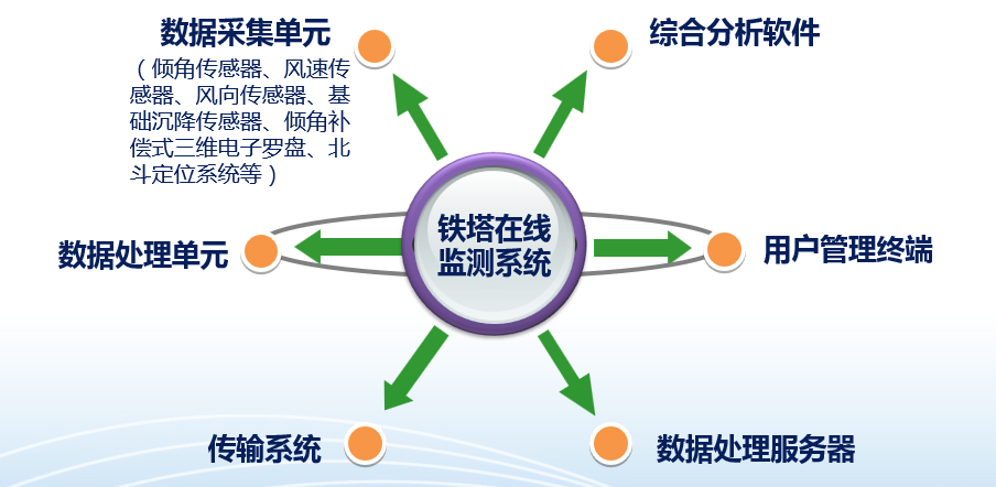 铁塔在线监测系统由数据采集单元(倾角传感器、风速传感器、风向传感器、基础沉降传感器、倾角补偿式三维电子罗盘、北斗定位系统等)、数据处理单元、传输系统、数据处理服务器、用户管理终端,以及综合分析软件组成。
