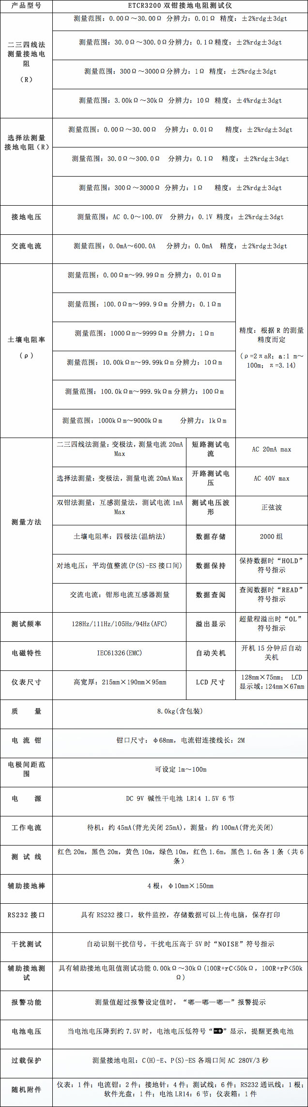 精密4线法、3线法、简易2线法、选择法、双钳法接地电阻测量,土壤电阻率、接地电压、交流电压测量,接地线漏电流、交流电流、直流电阻测量。